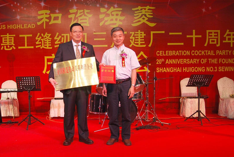 会上,上海市总工会领导刘卫新部长为企业颁发“全国模范劳动关系和谐企业”的奖状和奖牌。值得一提的是,惠工三厂是全国缝制机械行业中唯一获得此项光荣称号的企业,也是我市唯一获得此项殊荣的集体所有制企业。随后,大会对长期以来在各个岗位上积极为企业管理和生产经营献计出力、竭诚尽智的先进模范人物进行了表彰。原中国标准缝纫机公司总经理刘兴邦先生;上海远中实业有限公司董事长沈明龙先生被授予杰出贡献奖;原中国标准缝纫机公司副总经理、上海惠工缝纫机三厂顾问黄明昶先生被授予开创伯乐奖;区政协委员、上海惠工缝纫机三厂厂长王瑞福先生被授予卓越成就奖。希望广大干部员工以他们为榜样,在新的起点上把海菱的事业不断推向更高的巅峰。