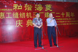 庆典酒会上,王瑞福厂长首先代表上海惠工缝纫机三厂全体员工向长期以来关心和支持海菱发展的各位领导、合作伙伴和来宾朋友们表示热烈的欢迎和衷心的感谢。今天的海菱,从无到有,从小到大,已成为我国工业缝制设备研制生产的骨干企业;今天的海菱,技术领先,创新求变,主打的厚料机和特种机在性能和技术水平上确立了国内领先、国际先进的行业地位;今天的海菱,诚信立业,走向世界,产品遍布欧美、日韩、亚洲等90多个国家和地区,连续多年出口创汇额稳居国内同行业前列;今天的海菱,以人为本,和谐共赢,企业建立了具有四海一家的“海菱”特色用人机制,为建设和谐社会贡献力量;今天的海菱,放眼未来,科学发展,企业实施流程化、标准化、规范化、精细化的管理机制,“海菱”商标连续多年荣获“上海市著名商标”、“上海市名牌产品”,被认定为“中国驰名商标”,跻身中国轻工业缝制机械行业十强之列,并获得全国模范劳动关系和谐企业等荣誉。总结二十年的发展历程,几代海菱人励精图治、顽强拼搏,以敢为人先,赶超一流的姿态,开辟了一条独具“海菱”特色的辉煌之路。