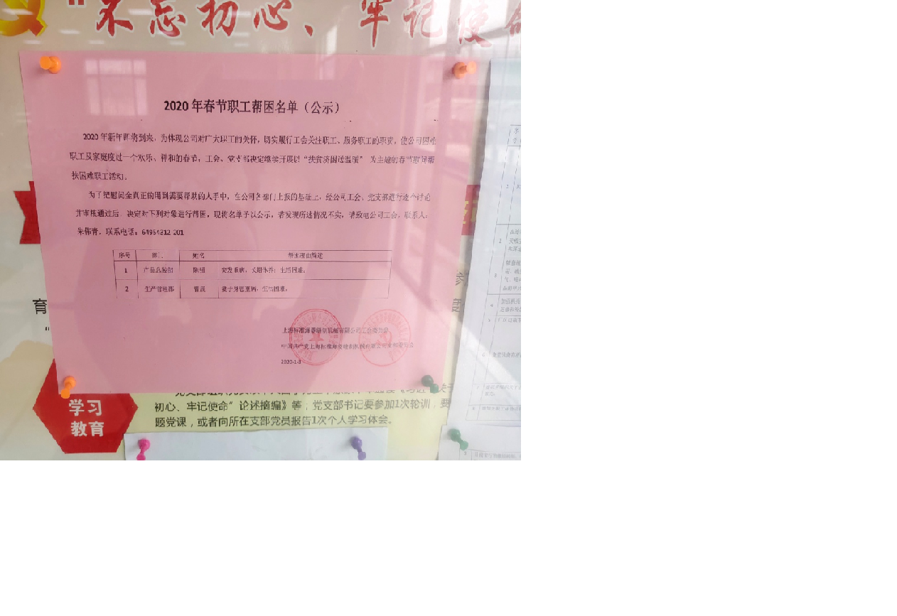 为认真贯彻落实松江区总工会《关于进一步做好“慈善一日捐”活动》的通知精神,标准海菱工会决定2020年1月3日在公司开展“慈善一日捐”活动。本次活动以坚持自愿、鼓励奉献为原则,广泛发动全公司职工捐款,捐款完成后,由公司工会将捐款统一上交松江经开区总工会。同时在新年即将到来之际,为体现公司对广大职工的关怀,切实履行工会关注职工、服务职工的职责,使公司困难职工及家庭度过一个欢乐、祥和的春节,标准海菱党支部及工会决定开展以“扶贫济困送温暖”为主题的春节慰问帮扶困难职工活动。